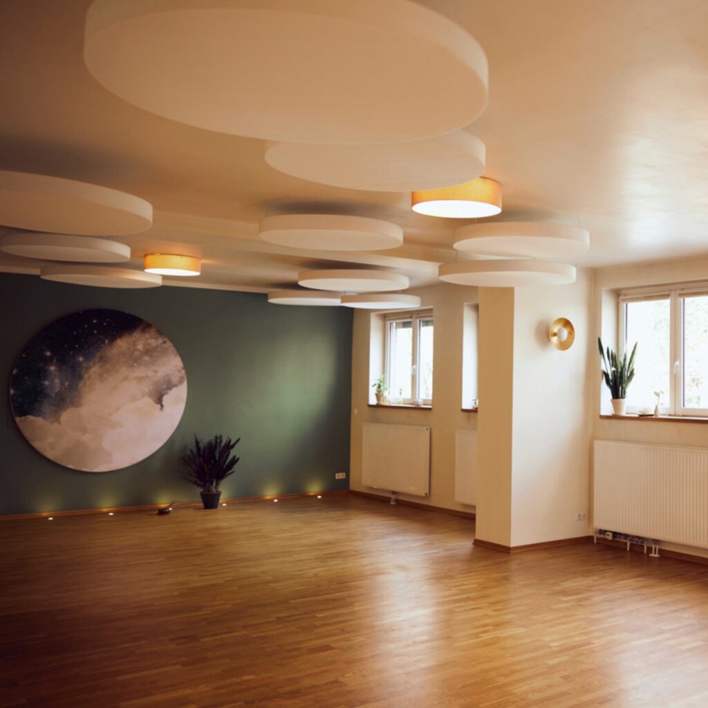 Dank der großzügigen Fensterfronten profitieren beide Yogaräume von viel hellem Tageslicht. In den späteren Stunden sorgen verschiedene direkte und indirekte Lichtquellen für eine wohlige Helligkeit und schaffen eine stimmungsvolle Atmosphäre.